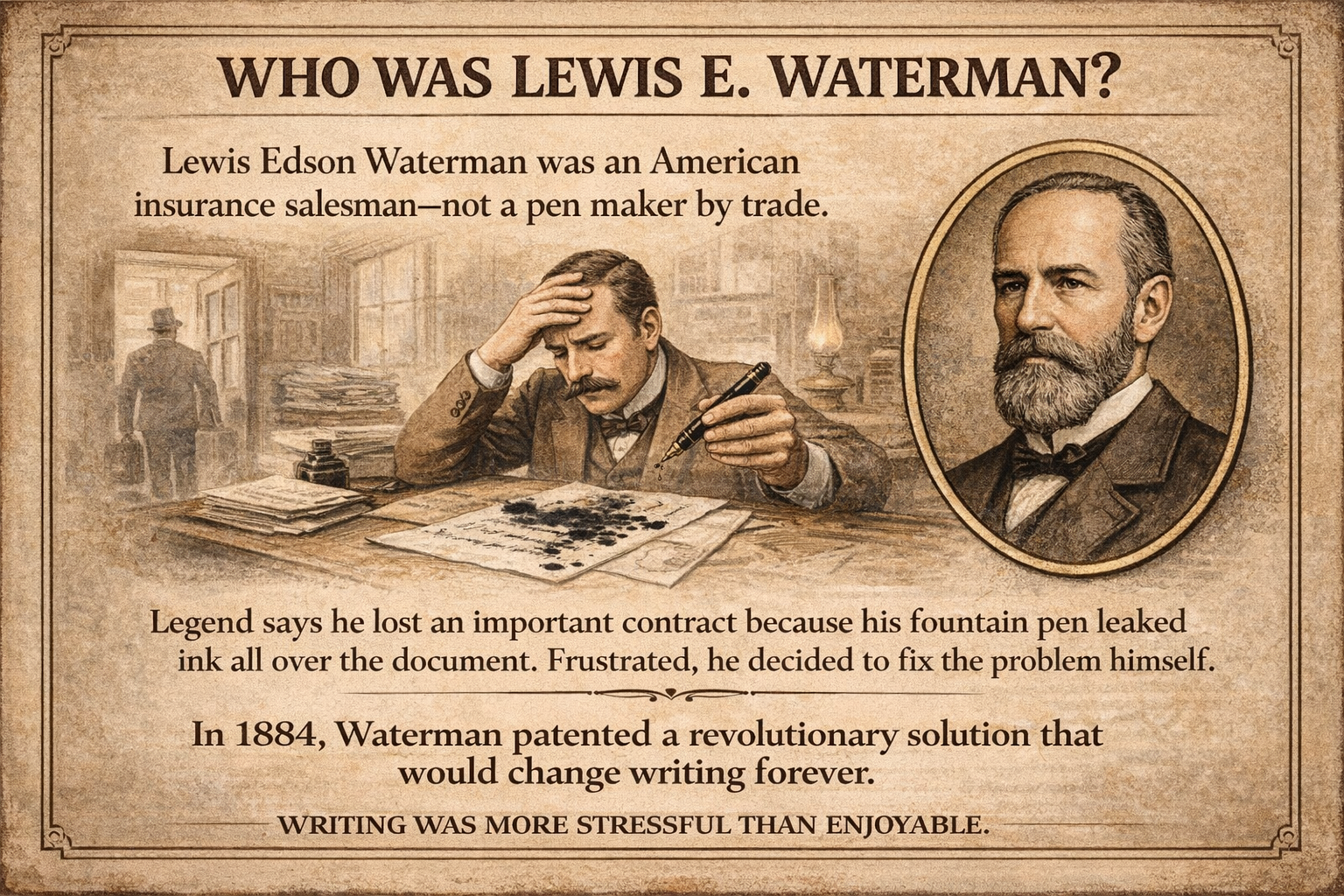 Lewis Edson Waterman was an American insurance salesman not a pen maker by trade. Legend says he lost an important contract because his fountain pen leaked ink all over the document. Frustrated, he decided to fix the problem himself. In 1884, Waterman patented a revolutionary solution that would change writing forever.